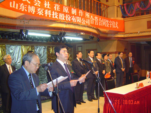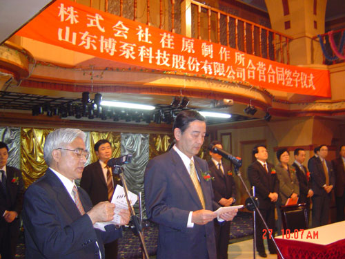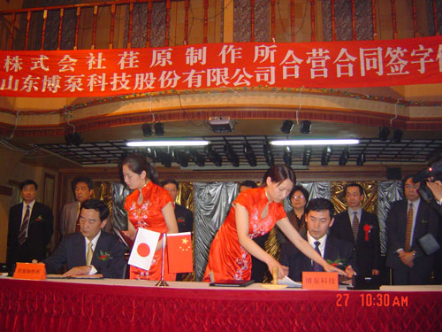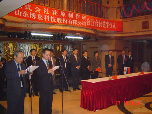 新聞中心 2005年4月27日,在博山萬杰國際大酒店山東博泵科技股份有限公司與日本株式會社荏原制作所正式簽署了注冊資本1100萬美元的合營公司――荏原博泵有限責(zé)任公司。該公司的建立將通過引進(jìn)世界最大的泵企業(yè)――日本株式會社荏原制作所的先進(jìn)技術(shù),加快大型泵、高壓泵國產(chǎn)化進(jìn)程,建成具有國際競爭力的一流企業(yè)。為中國水電、核電及超臨界火電項目,為南水北調(diào)等大型水力工程提供高質(zhì)量、高技術(shù)含量的一流泵產(chǎn)品,提升中國機械工業(yè)技術(shù)、質(zhì)量水平,促進(jìn)產(chǎn)品更新?lián)Q代,為中國電力、冶金、水力事業(yè)的發(fā)展乃至中國國民經(jīng)濟(jì)的發(fā)展做出應(yīng)有的貢獻(xiàn)。