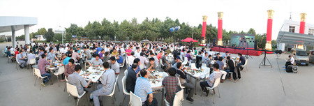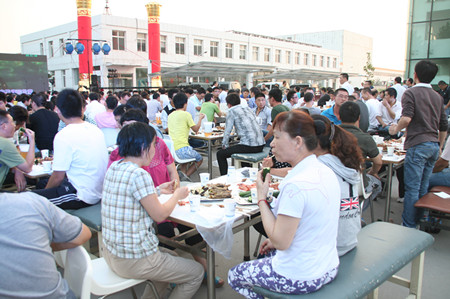 下午5點,在夕陽的映照中,公司辦公樓前,忙碌的員工穿梭在會場,辦公樓南面已搭建好舞臺,碩大的LED屏矗立在舞臺上。舞臺兩側(cè)各豎立著兩個團結(jié)柱。舞臺前的空地上,已擺放好63張桌子,每張桌子配放6把椅子。桌子上,豐盛的飯菜已放好,靠西邊的草坪旁,是備好的新鮮的青島扎啤。